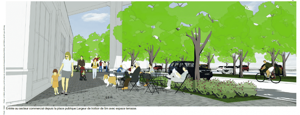 Des arbres choisis soigneusement selon le répertoire des arbres recommandés en milieu urbain seront plantés pour assurer des parties ombragées sur le stationnement. Des bandes d’espaces verts sont également prévues ainsi que des espaces terrasse à l’entrée du secteur commercial!